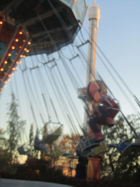 Syksy on ollut ihana. Aurinkoinen, kuiva ja utuinen. Lomalla käytiin myös Lintsin valokarnevaaleilla. Valot on hieno idea alkavan pimeyden keskelle. Muutuin itsekin lapseksi jälleen ja kävin kolme kertaa vuoristoradassa (tuttu tervan tuoksu ja pelko siitä kestääkö vanha puinen rakenne). En ole ennen huomannutkaan, että vuoristoradassa kasvaa keskellä puita. Kuljen yhä useammin katsoen maailmaa vihreiden lasien läpi.