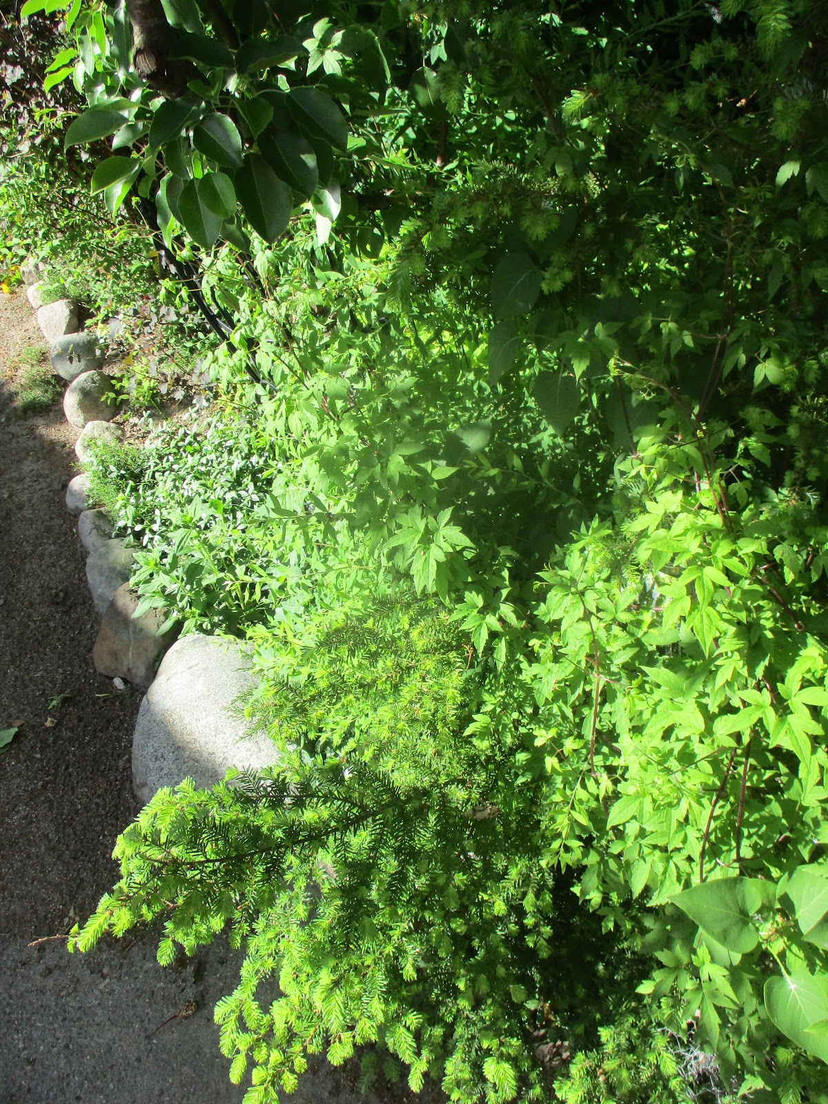 Yritys peittää kuivaa maata: pensaita ja puita, tämä kohta on ikuisesti hieman työn alla. Viimeksi siirsin tähän lisää pensaita toisaalta. Monenlaista siinä kasvaa. Japaninhemlokki ei kärsinyt viime painajaistalvesta, yllätyin.